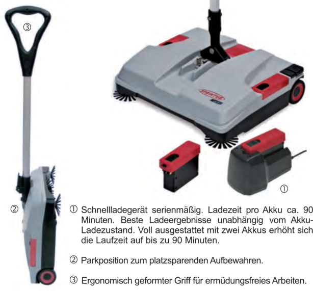 Gewerbliche Akkukehrmaschine für die schnel-le, kabllose und leise Zwischenreinigung aller Oberflächen, In-