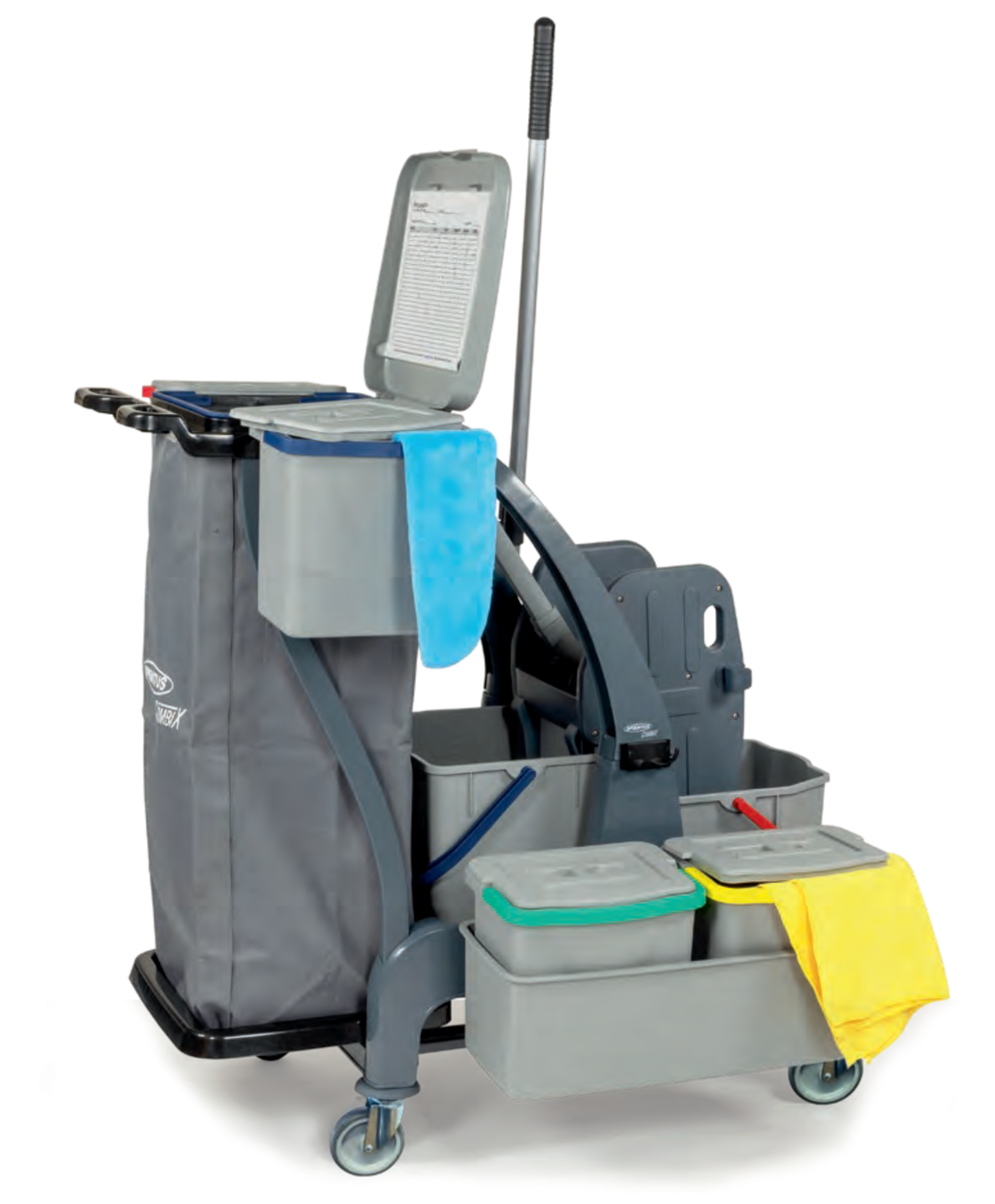 Für die Flur-, Zimmer- und Badreinigung in öffentlichen Einrichtungen, Büros, Hotels, Pensionen. Farblich getrennte Wischeimer und Halterung für Wäsche-/ Müllsack.Der Reinigungswagen in Profiqualität besteht aus zwei robusten Kunststoff Bodenplatten, wobei die hintere Ablage je nach Bedarf abgenommen werden kann. Die stabilen Metall-Lenkrollen und die großen, gummierten Hinterräder erfüllen die Anforderungen für den täglichen, Einsatz. Der Deckel über dem Wäsche-/ Müllsack kann bequem vom ergonomisch geformten Schubbügel aus bedient werden. Ein Mopp oder Besen kann sicher im integrierten Halter fixiert werden. Für das Warnschild ist eine gesonderte Halterung am Rahmen integriert. Serienmäßig wird der PuriX mit vier Eimern, einer seitlichen Moppablage, geräumigem 120 Liter Wäsche-/Müllsack und einer Doppelbacken-Mopp-Presse ausgeliefert. Am Wagen kann eine Medusa Akkukehrmaschine mitgeführt werden.